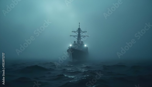 A naval destroyer emerges through fog with faint lights and a churning sea below.