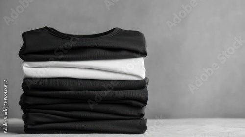 clothing, fashion, stack, black, white, fabric, textile, casual attire, apparel, design, minimalism, clothes rack, style, comfort, outfit, monochrome, neat, organised, modern, simplicity, aesthetic, cotton, shirt, top, casual clothes, soft, clean, trendy, versatile, everyday, essential, uniform, presentation, quality, material, collection, chic, contemporary, closet, home, display, retail, shopping, boutique, choice, contrast, elegance