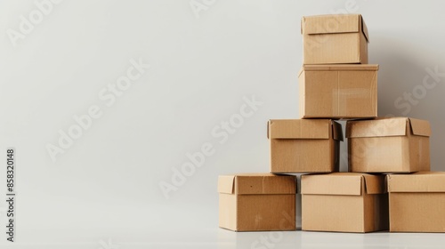 A neatly stacked pyramid of brown packaging boxes and containers on a clean, white background, with plenty of copy space around for text or branding