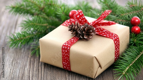 A neatly wrapped gift sits on a wooden surface, adorned with a bright red ribbon and pinecones, complemented by surrounding evergreen branches that evoke festive cheer