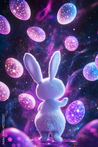 neon, easter, rabbit, standing, cosmic, background, surrounded, floating, egg, radiate, glowing, galaxy, pattern