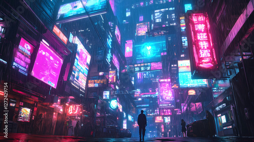 city landscape, person, exploring, street, filled, holographic, advertisement, glowing, signs, futuristic, architecture, street, illustration