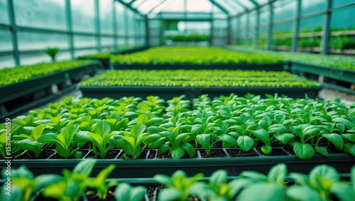 A new perspective on the containers of green spinach plants inside the greenhouse.