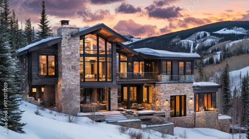 A newly built house with a modern mountain retreat design, featuring natural stone, timber accents, and large windows with panoramic views.