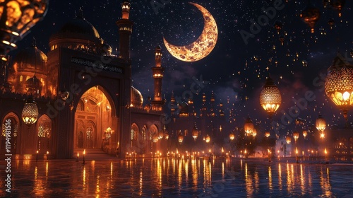 mosque, night, ramadan, light, lantern, water, moon, star, islam, muslim, festival, celebration, faith, belief, spiritual, holy, architecture, building, gold, orange, dark, sky, beautiful, scenic, peaceful, serene, calm, tranquil, divine, religious, culture, tradition, fantasy, artistic, glowing, illuminated, magical, wonder, dreamlike, enchanting