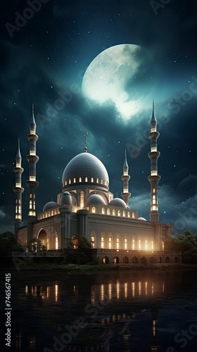 a night scene with a mosque and a crescent moon in the sky with stars and clouds in the background with generative ai