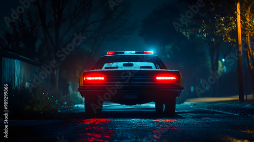A nighttime scene of a police car with flashing lights.