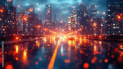 A nighttime urban scene featuring modern skyscrapers with sleek glass facades.