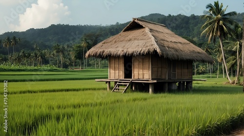 a nipa hut on the middle of rice fields farm from Generative AI