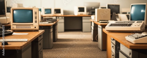 A nostalgic view of a vintage office space with old computers and wooden desks, capturing the essence of retro technology.