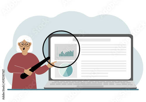 show, report, presentation, laptop, magnifying glass, woman, old, pensioner, elderly, adult, grandmother, magnifier, finance, inspecting, vector, illustration, business, information, computer, technology, digital, concept, cyberspace, web, search, research, management, online, person, work, strategy, marketing, banner, datum, planning, flat