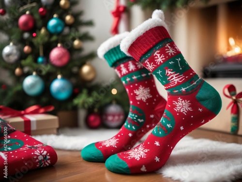 christmas tree, christmas, fireplace, gift, box, christmas ornament, candle, foot, gift box, indoor, depth of field, wooden floor, sock, pantyhose, sole, rug, boot, christmas lights, toe, carpet, realistic, floral pattern, ribbon, fire