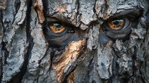 A Pair of Eyes Peering From Within the Rough Bark of a Tree