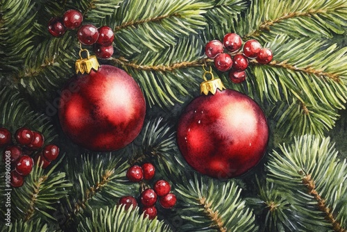 A pair of festive red ornaments hang from a decorated Christmas tree