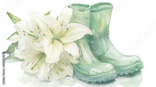 A pair of green rain boots stand next to a white lily flower, spring concept watercolor illustration.