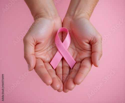 A pair of hands grasping a pink ribbon on a pastel pink background, representing solidarity and hope.