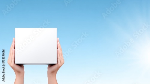 A pair of hands holds a blank box against a clear blue sky, symbolizing potential and new opportunities.