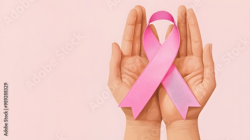 A pair of hands holds a pink ribbon, symbolizing awareness for breast cancer, set against a soft pink background.