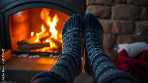 A pair of socks warming by the fireplace, representing a cozy winter atmosphere indoors. Christmas 2025 new year. Generative AI