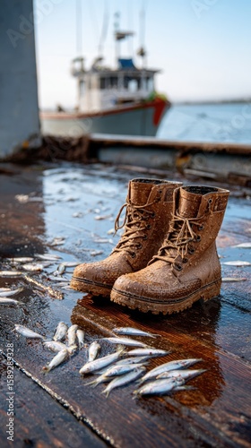 A pair of worn rubber fisherman boots standing firmly on a wet boat deck scattered with fresh fish