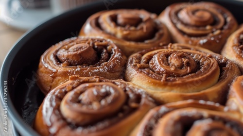 a pan filled with cinnamon rolls sitting on top of a wooden table next to a cup of coffee on top of a wooden table.