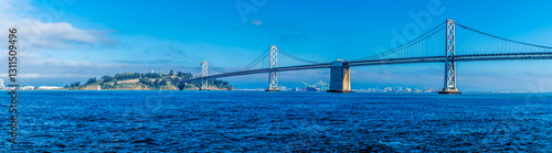 A panorama view from the Ferry Terminal Plaza towards the Oakland Bay bridge and Yerba Buena Island in San Francisco in early springtime