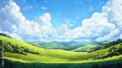 nature, landscape, hill, meadow, blue skies, cloud, serene, lush, greenery, vibrant, calmness, scenery, panoramic, beauty, environment, pastoral, idylli, healthy, ecosystem, fresh, daytime, rural, sunlight, peaceful, travel, summer, exploration, adventure, leisure, joy, sky, horizon, scenic, wellness, harmony, flora, fauna, agriculture, freedom, picturesque, wildflower, sunshine, breathtaking, escape, rejuvenation, biodiversity, retreat, relaxation