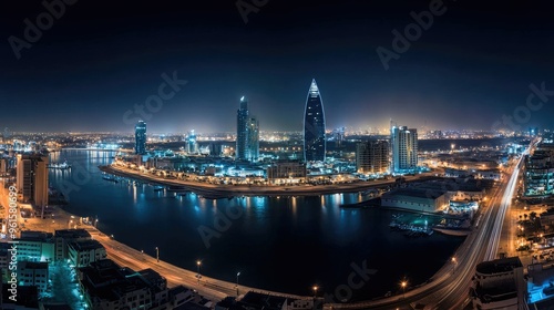 A panoramic night view of the Four Seasons and Hilton Hotels in Manama, Bahrain, their lights creating a mesmerizing scene.