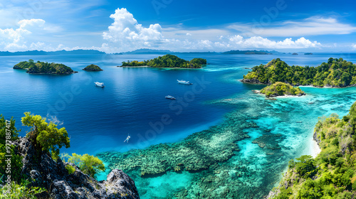 A panoramic view of a tropical island chain with small islands scattered across the ocean surrounded by vibrant coral reefs and crystal-clear water.