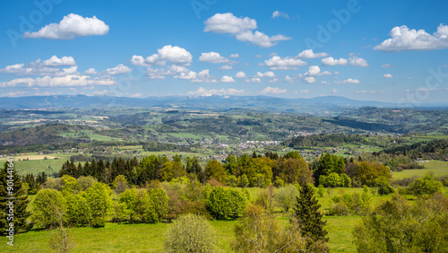 A panoramic view of the Krkonose mountains from Kozakov Mountain in the Bohemian Paradise, Czechia. The image captures a sunny day with a clear sky and rolling green hills.
