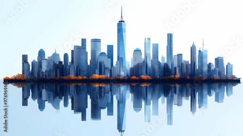 A panoramic view of the New York City skyline with tall skyscrapers reflected in the water.