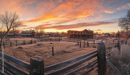 A panoramic view of the old West town at sunset, with wooden buildings and brick walls against