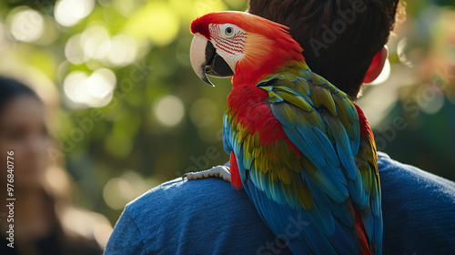 parrot, talking, perched, shoulder, owner, pet, animal, indoor, bright, colourful, bird, feather, vibrant, companion, exotic, tropical, fun, friendly, joyful, interactive