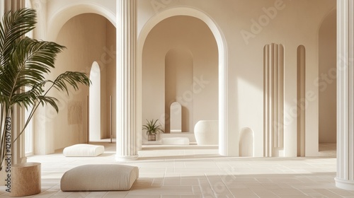 A pastel-hued luxury interior with grand white columns, soft beige stucco walls, and tiles arranged in an elegant geometric pattern.