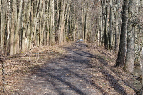 A path in the spring forest. April. Moscow region.