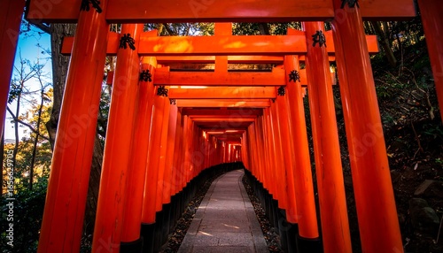A path lined with vibrant, traditional japanese torii gates.