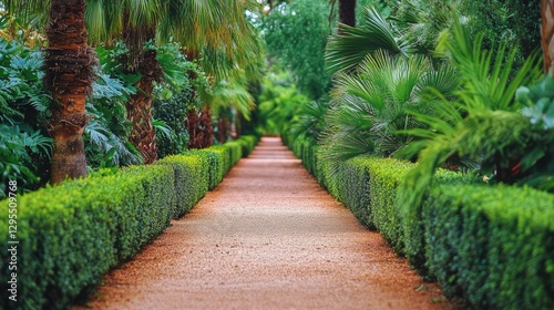 A pathway with a mix of tropical plants and neatly cut hedges.