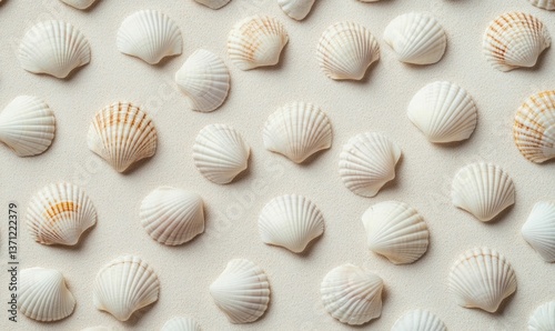 A pattern of seashells on the sand creates a calming beach vibe and summer vacation feel.