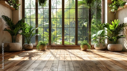 A peaceful and stylish room with indoor greenery gathered by a grand window allowing through ample sunlight on a wooden floor