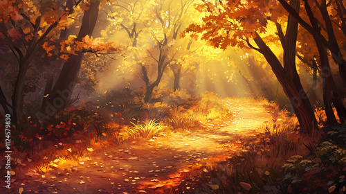 A peaceful autumn forest path covered in fallen leaves, with warm sunlight streaming through the trees.