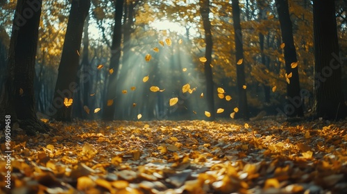 A peaceful autumn scene with golden leaves scattered across a forest floor, sunlight filtering through the trees.