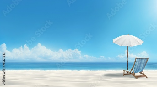 A peaceful beach setting features a single chair and umbrella on soft sand, with calm ocean waves and fluffy clouds in the distance under bright sunny skies