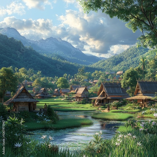 A peaceful lake surrounded by mountains with a charming village and lush autumn trees