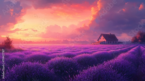 A peaceful lavender field under a vibrant sunset, with a quaint house in the background, creating a serene and picturesque landscape.