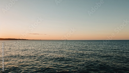 A peaceful sea horizon at sunset or sunrise with calm waters and a distant shoreline.