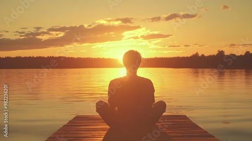 A peaceful sunset view with a person meditating by the serene lake, reflecting tranquility and mindfulness in nature.