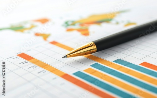 A pen rests on a vibrant financial graph showcasing colorful bars and a world map, emphasizing data analysis and visualization.