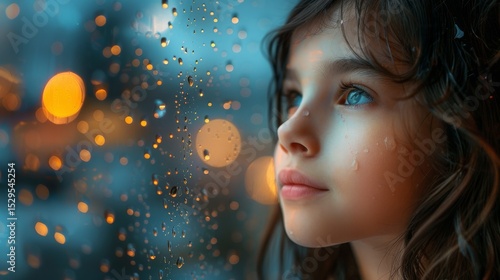 A pensive young girl gazes through a window smeared with raindrops, reflecting deep emotions and curiosity, illuminated by soft light and warm colors around her.