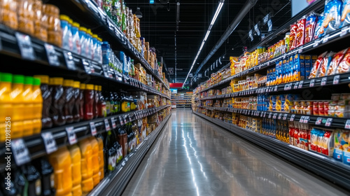 A perfectly organized supermarket aisle with well-stocked shelves, showcasing a wide variety of products. The shelves are meticulously arranged, with every item aligned in neat row