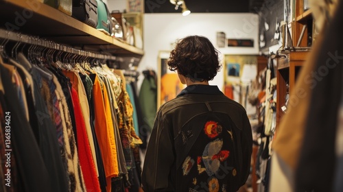 store, shop, clothing, rack, person, browsing, vintage, fashion, apparel, textile, fabric, hanger, display, inside, retail, aisle, jacket, shelf, item, merchandise, colours, looking, client, shopping, style, choice, second hand, design, texture, worn, pattern, boutique, consumer, retro, market, interior, lighting, warm, dark, wood, unique, selection, arrangement, organised, casual attire, individual